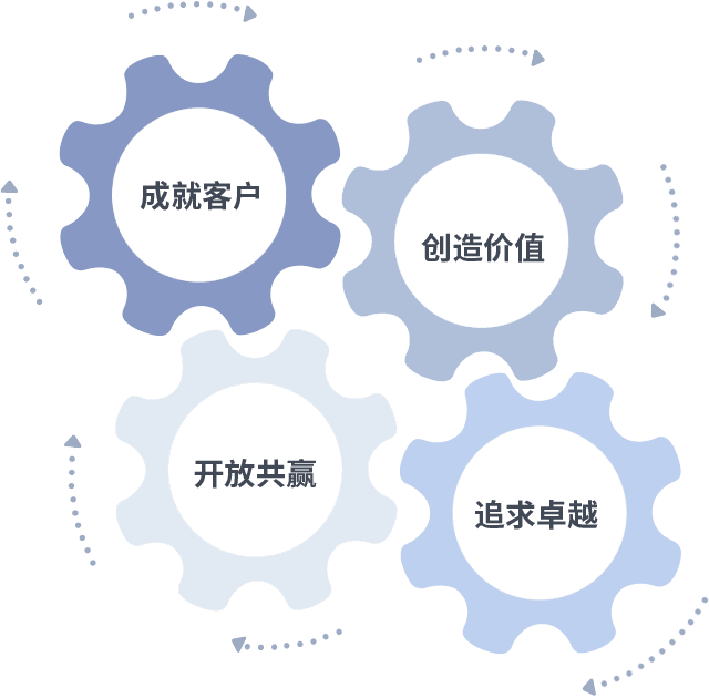 成就客户是一切决策的出发点,,,,创造价值是衡量所有工作的标准,,追求卓越是我们做事做人的态度,,,开放共赢是我们的格局也是最终的结果。。价值观的齿轮环环相扣,,,推动着组织里的每个人不断向前。。。
